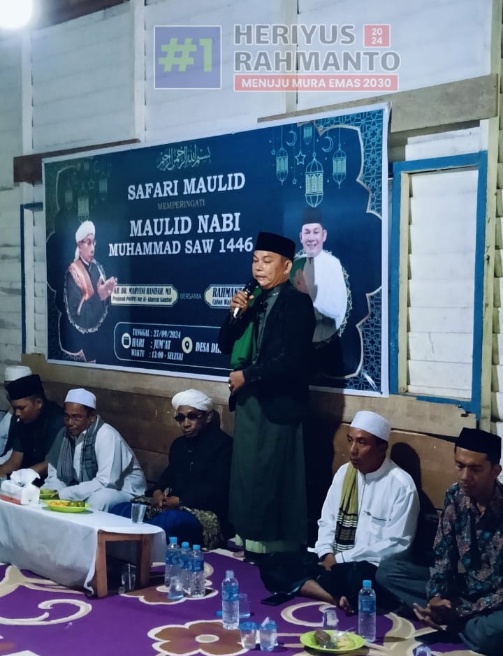 CNN, PURUK CAHU | Calon Wakil Bupati Rahmanto Muhidin,.,S.HI.,MH menghadiri kegiatan Safari Maulid Nabi Muhammad SAW di Majelis Ta’lim Bengkel Hati, Desa Dirung Lingkin, Jum’at(27/09/2024).