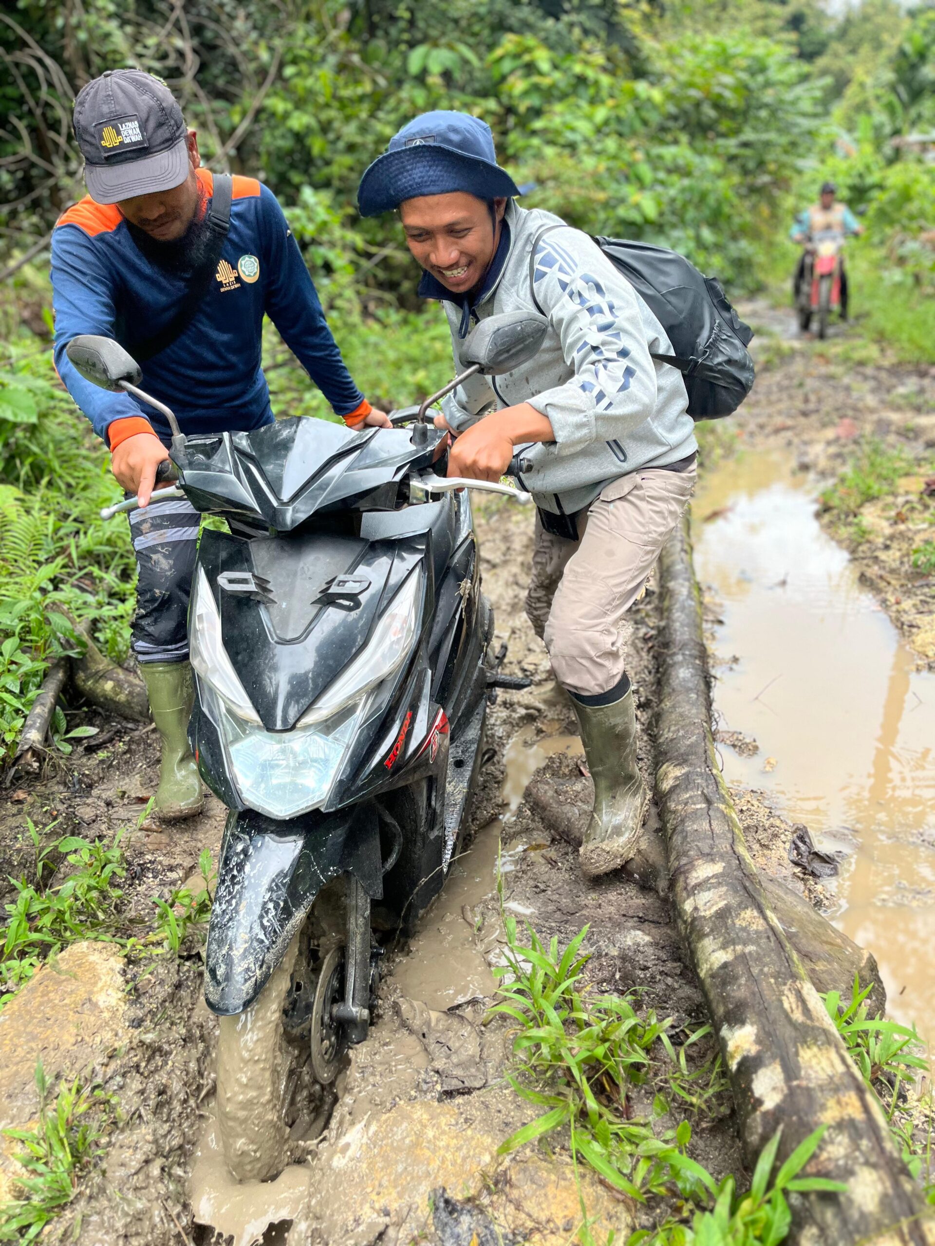 Perjalanan menuju Dusun Boriai bukan perjalanan biasa. Medan yang dilalui dipenuhi jalan berlumpur, licin, dan berbatu. Dalam perjalanan, rombongan mengalami empat kali terjatuh, dua unit sepeda motor mengalami kerusakan teknis, serta harus melakukan dua kali penggantian ban di tengah jalur yang jauh dari permukiman. Meski penuh risiko, semangat pengabdian tidak surut sedikit pun.