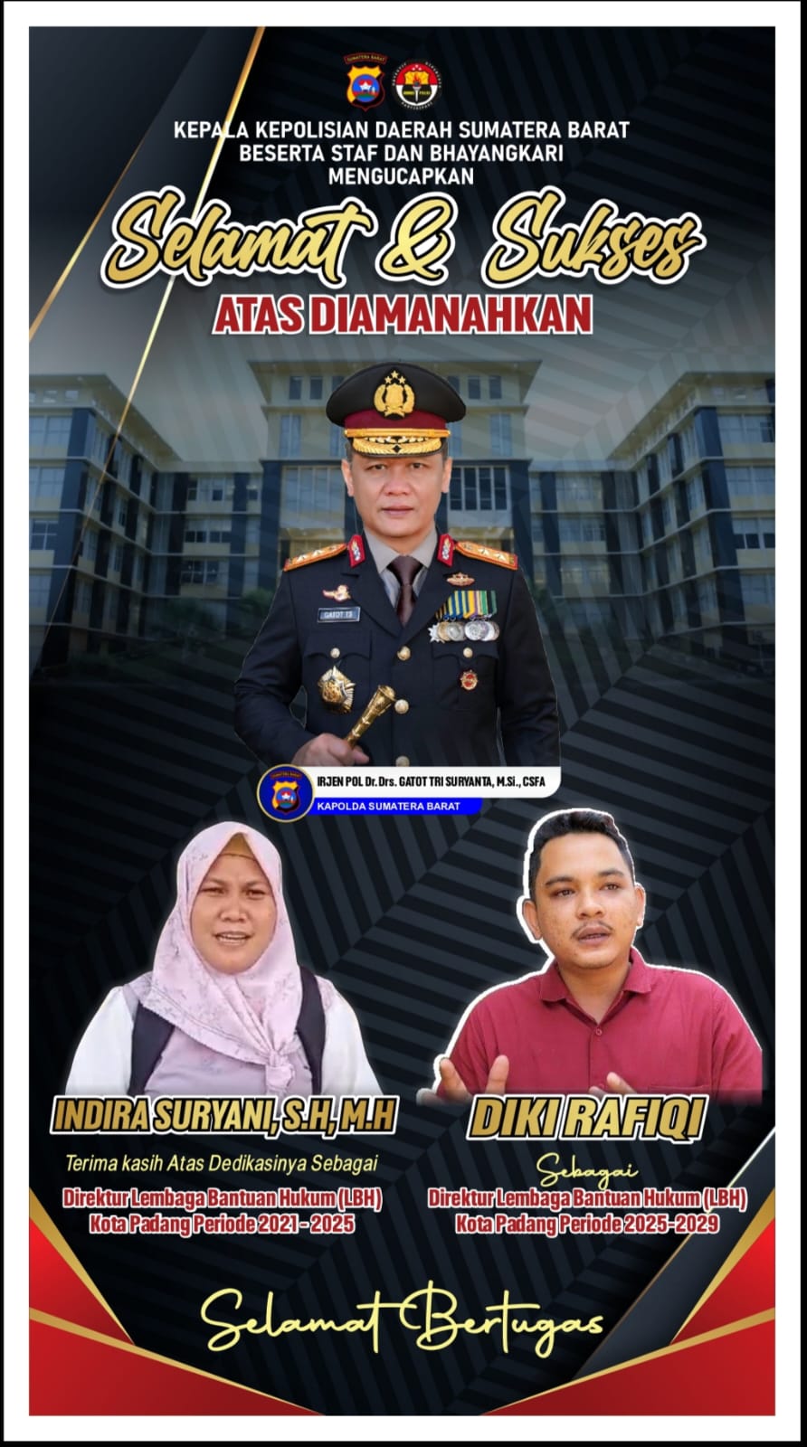 SUMBAR | Kapolda Sumbar, Irjen Pol Gatot Tri Suryanta mengucapkan selamat dan sukses atas pergantian Ketua LBH Padang Periode 2025-2029 kepada Diqi Rafiqi , dan tak lupa Kapolda Sumbar juga mengucapkan terima kasih kepada Indira Suryani yang telah menyelesaikan masa jabatannya dengan baik. Irjen Pol Gatot Tri Suryanta berharap LBH Padang ke depannya bisa semakin Profesional. Padang, Minggu 27 April 2025.