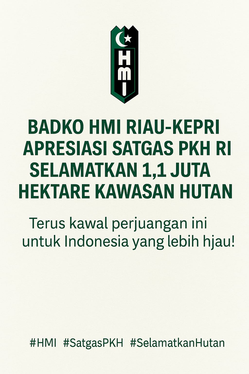 Pekanbaru, 27 April 2025 | Ketua Umum Badan Koordinasi Himpunan Mahasiswa Islam (Badko HMI) Riau-Kepri, Wiriyanto Aswir, memberikan apresiasi tinggi kepada Satuan Tugas Penertiban Kawasan Hutan (Satgas PKH) Republik Indonesia atas capaian luar biasa dalam menyelamatkan aset negara dari penguasaan ilegal.