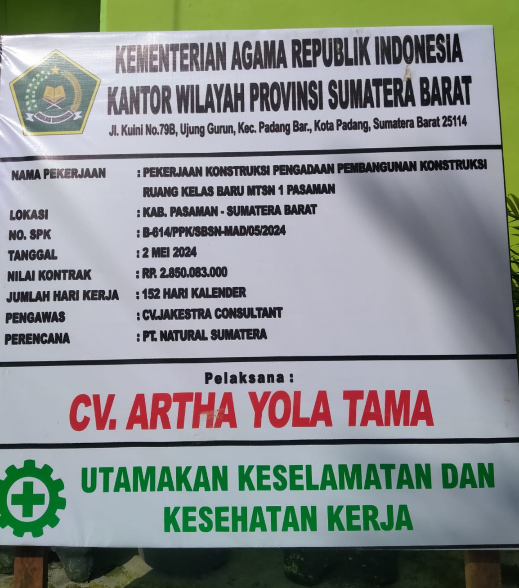 Pasaman | Pekerjaan konstruksi pengadaan pembangunan konstruksi ruang kelas baru MTSN 1 Pasaman dinilai rendah pengawasan oleh perusahaan pemenang tender yang dikerjakan oleh CV ARTHA YOLA TAMA, hal ini di buktikan dengan kunjungan awak media ke lokasi proyek pada tanggal 12 Mei dan 17 Mei 2024, tidak satupun personil perusahaan yang tertera di kontrak berada di lokasi pekerjaan.
