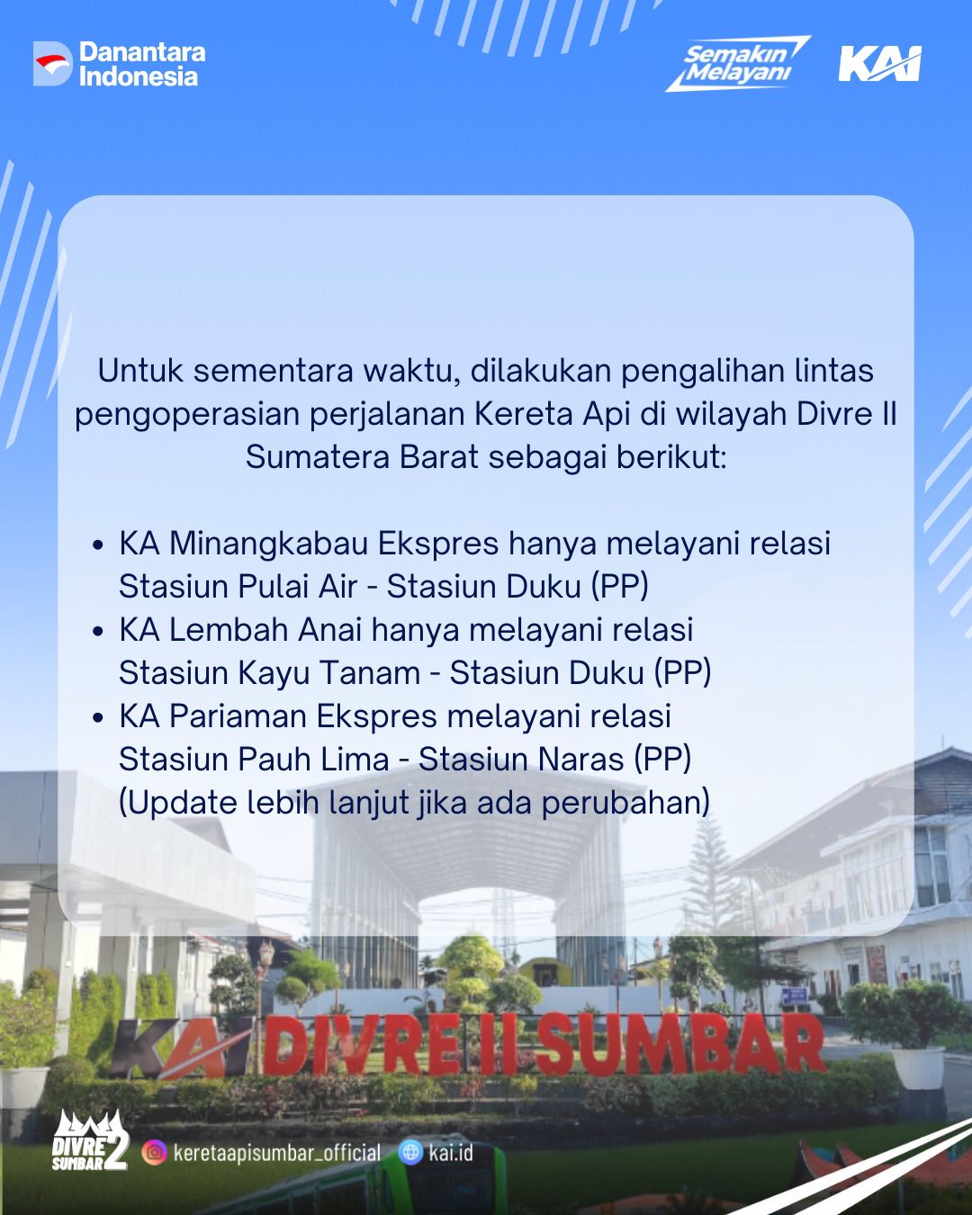 KAI mengimbau pelanggan untuk terus mengikuti informasi terbaru melalui Contact Center 121, WhatsApp 0811-222-33-121, email cs@kai.id, serta akun media sosial resmi @keretaapisumbar_official dan @KAI121.
