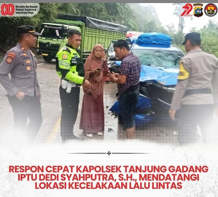 Tanjung Gadang, Sabtu (4/10/2025) | Dalam kondisi hujan deras dan jalanan licin, Kapolsek Tanjung Gadang IPTU Dedi Syahputra, S.H. bersama sejumlah personel Polsek Tanjung Gadang dengan sigap mendatangi lokasi kecelakaan lalu lintas yang terjadi di kawasan jalan lintas utama Kecamatan Tanjung Gadang, Kabupaten Sijunjung, Sumatera Barat.